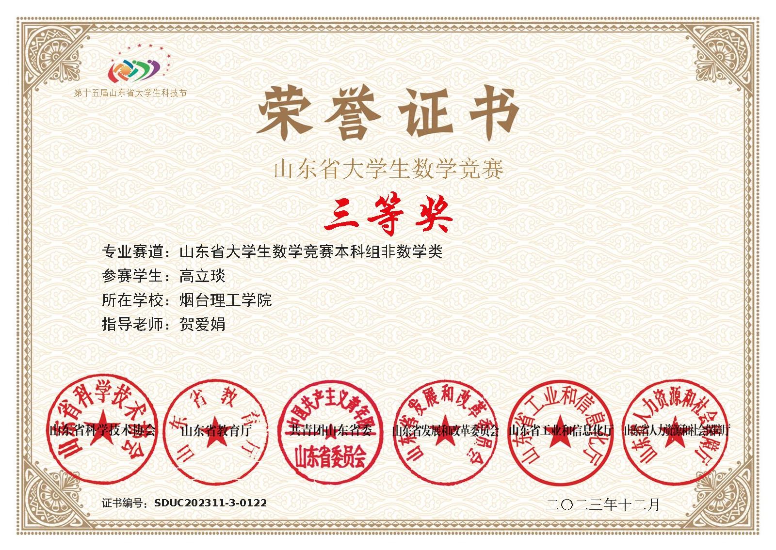 第十五届山东省大学生数学竞赛(非数学类)荣誉证书